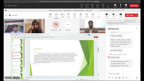 There were five distinguished speakers: Laxminarayan Nanda (Child Protection Specialist, UNICEF Assam, India), Anna Gupta (Professor of Social Work, Royal Holloway, University of London), Vanisha Jassal (Senior Lecturer, University of Kent), Prita Jha (President & Founder, Peace and Equality Cell, India), and Madhumita Das (Psychologist & Acting General Secretary, Indian Council for Child Welfare, India). Laxminarayan, Prita and Madhumita shared their groundwork practitioner insights, socio-legal and criminological understanding, and experiences of working on child sexual abuse cases in India. Anna and Vanisha shared their academic insights respectively from social work and a narrative inquiry perspective into experiences of South Asian victims/survivors living in Britain. Prof. Barn and the guest speakers expressed their happiness to see so many researchers working in the field of child sexual abuse and appreciated the organisers to build this platform. They also encouraged the participants to come together and collaborate with the department by building a sustained network of researchers and publish high quality research works.